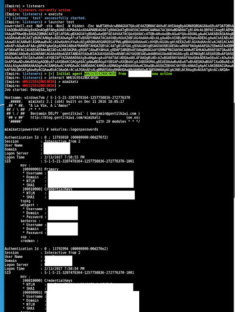 Following my last post about how to hunt for malicious PowerShell commands, I'm interested to detect Mimikatz once it is launched through PowerShell, like for example with PowerShellEmpire framework. Mark Russinovich has just written that in order to detect Mimikatz you must monitor lsass.exe for process access.